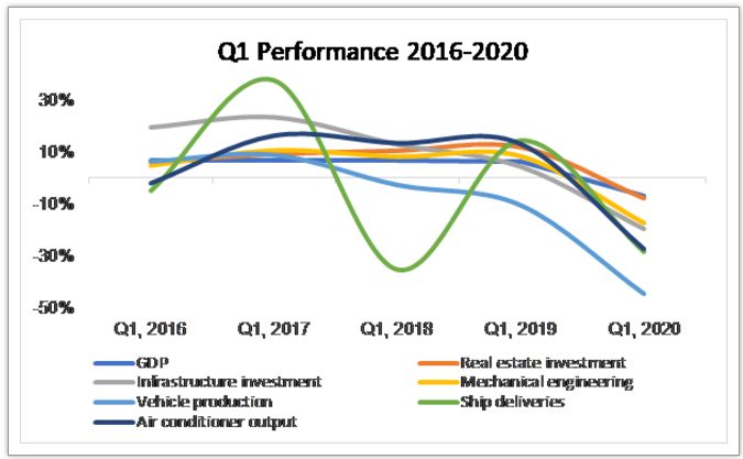 其中包括:GDP下降6.8%,房地產(chǎn)投資下降7.7%,基建投資下降19.7%,通用機械下降17.2%,汽車產(chǎn)量下降44.6%,船舶交貨量下降28.5%,空調(diào)產(chǎn)量下降27.5%。